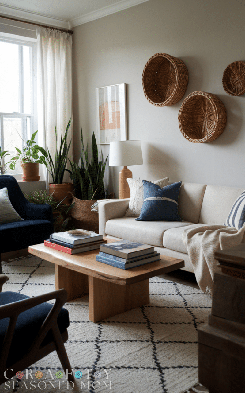 Incorporate natural elements like wood, stone, or woven baskets to create an earthy, cozy vibe. Small touches, like a wooden coffee table, wicker baskets for storage, or potted plants, bring warmth and texture. These elements make your living room feel grounded and welcoming. Using nature-inspired decor is a timeless, budget-friendly cozy living room decor idea that enhances the overall ambiance.