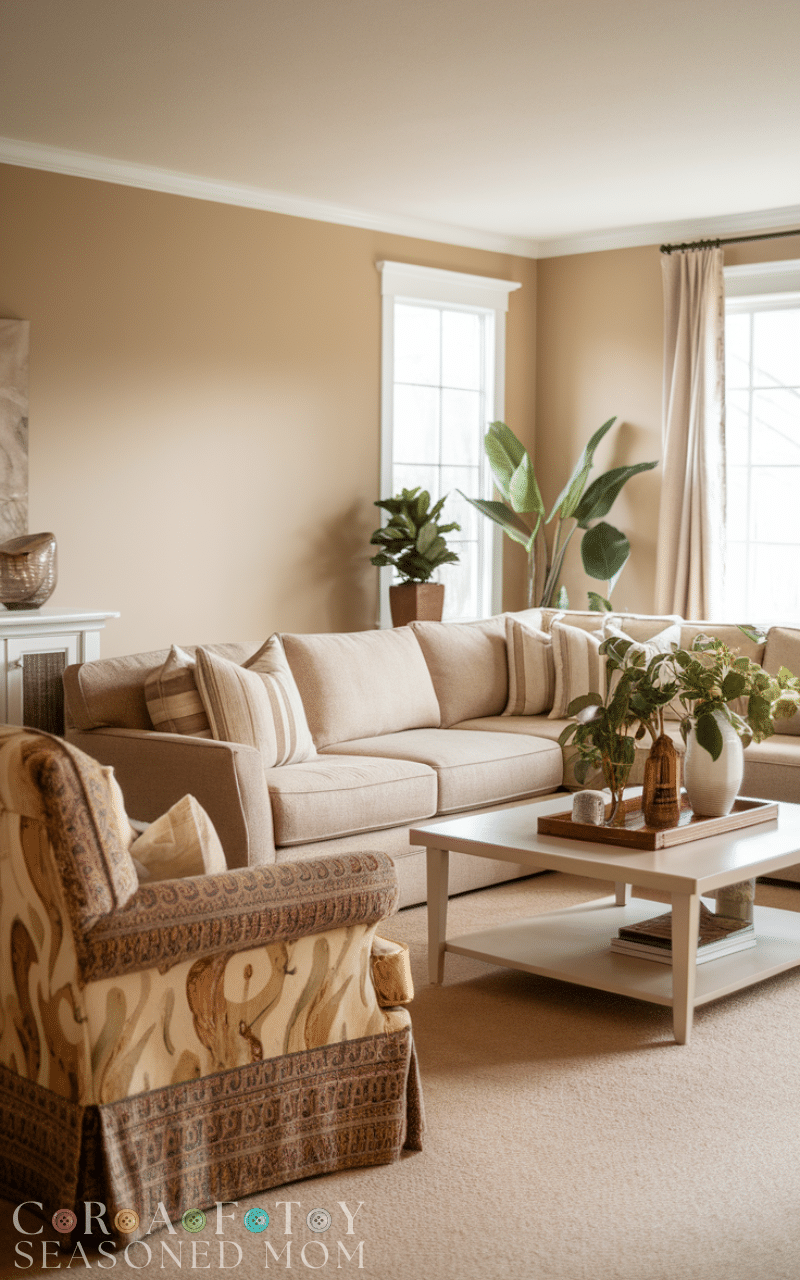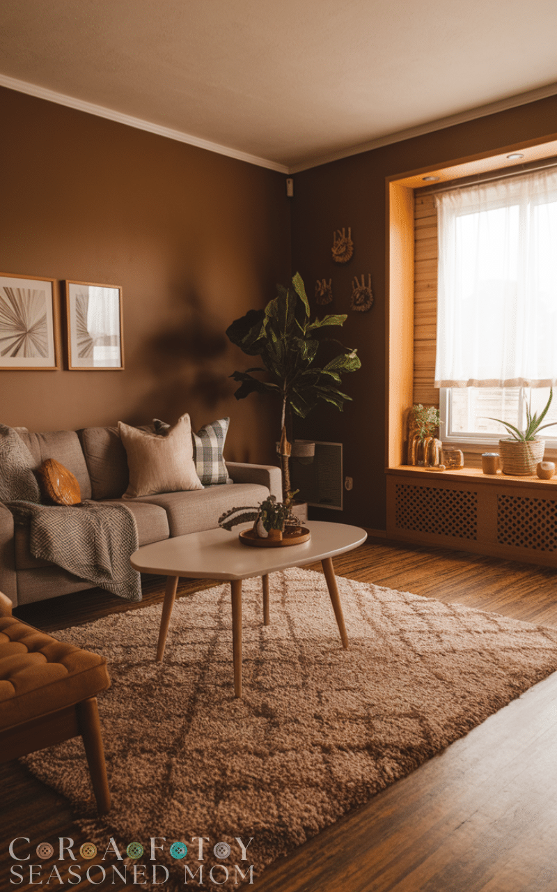 The transformation into a true Cozy Living Room Decor masterpiece came down to the “layers.” We primed over that terrible green and painted a warm neutral on three walls, with a dark, moody accent wall behind the TV to add depth. I draped a fringed velvet piano shawl over the table for texture and added several plush, woven cushions and a chunky knit throw to the new sofa. To solve the seating issue for my group of seven, I tucked a few lavish, upholstered Parsons chairs against the wall; they look like decor until we need to pull them out for a game. With a mix of floor lamps and warm-toned ambient lighting, the space finally feels lived-in and inviting. It’s no longer just an apartment; it’s a sanctuary where my friends actually want to linger.