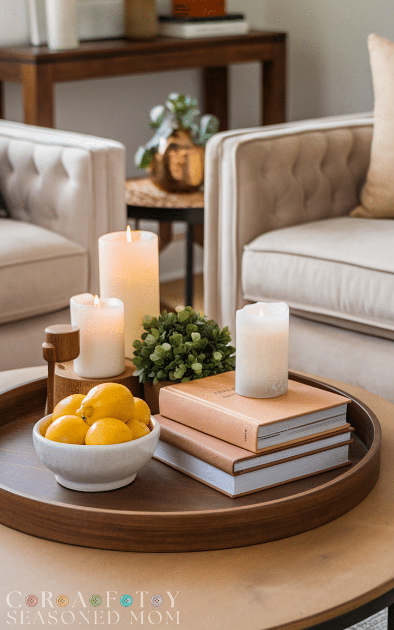 Style your coffee table with books, candles, trays, or small decorative objects. Group items in odd numbers for a visually pleasing arrangement. This small detail makes your living room feel curated and cozy. Coffee table styling is a simple cozy living room decor idea that enhances warmth and charm.