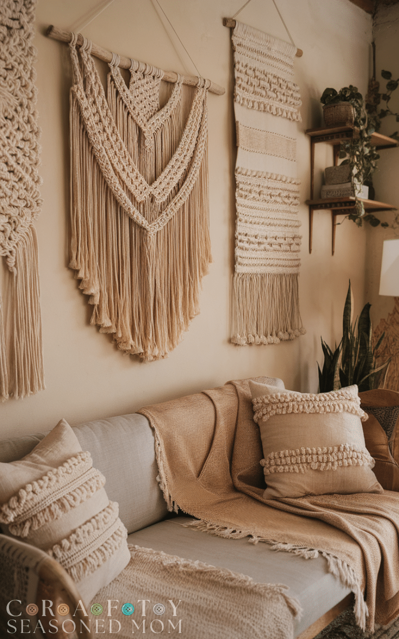 Add macramé, woven tapestries, or fabric wall hangings to create depth and texture. These pieces bring warmth and artistry to a blank wall. Textured wall hangings are an easy, affordable cozy living room decor idea that adds character without overpowering the space.