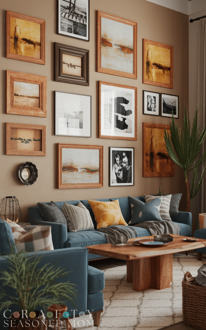 Decorate your living room walls with art, photos, or a gallery wall to make the space feel personal and inviting. Choose warm-toned frames or cohesive color palettes for a cozy look. Wall art adds character and storytelling to your living room. This easy cozy living room decor idea elevates your space without cluttering it.