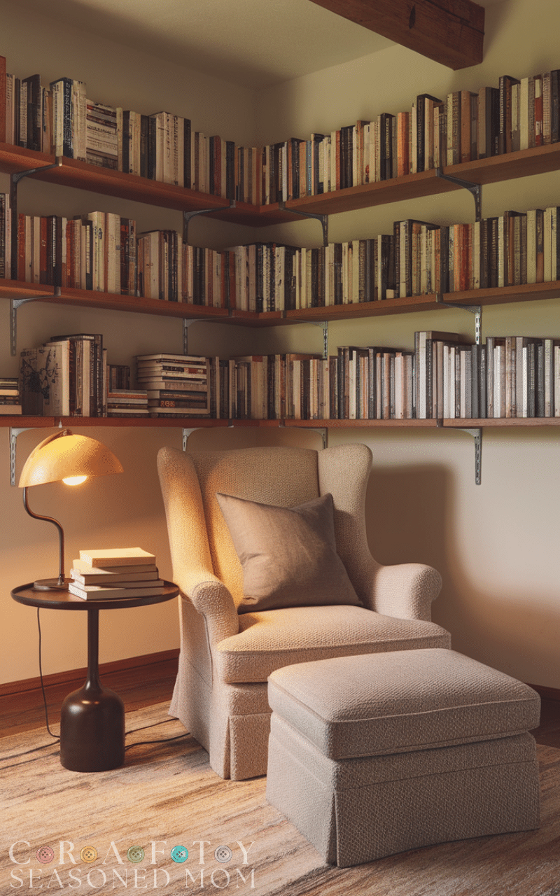 Create a reading nook with a comfortable chair, ottoman, and soft lighting. Add a small side table for books or a cup of tea. This space becomes your personal retreat within the living room. A reading nook is an easy cozy living room decor idea that combines comfort and functionality, encouraging relaxation and quality downtime.