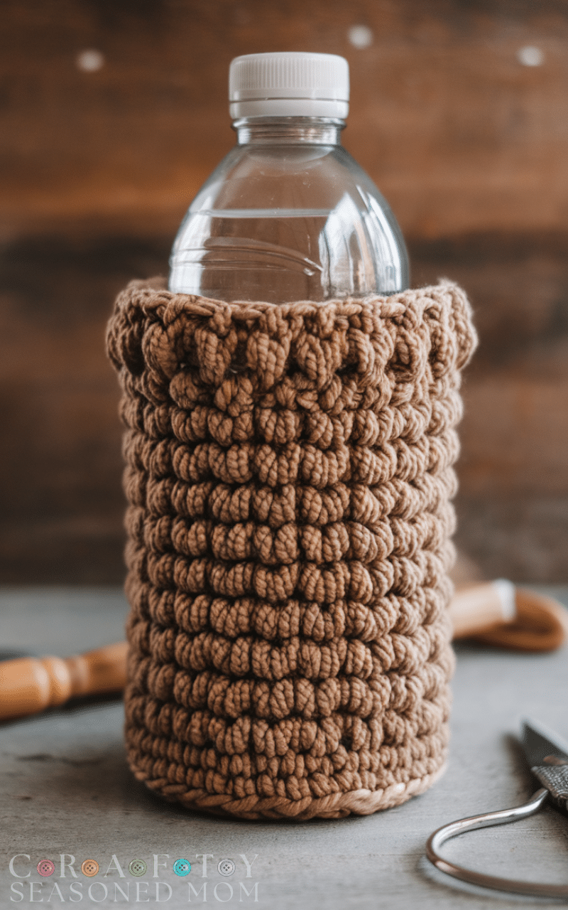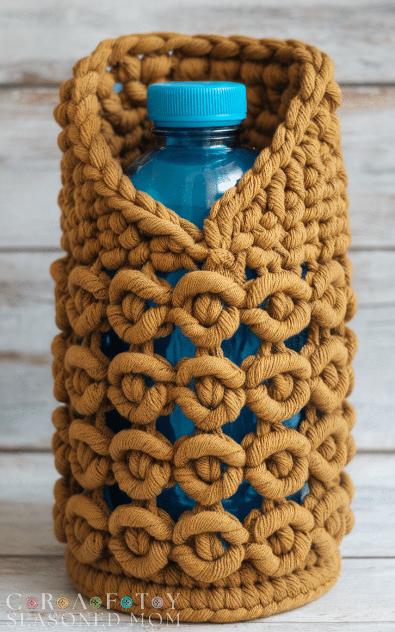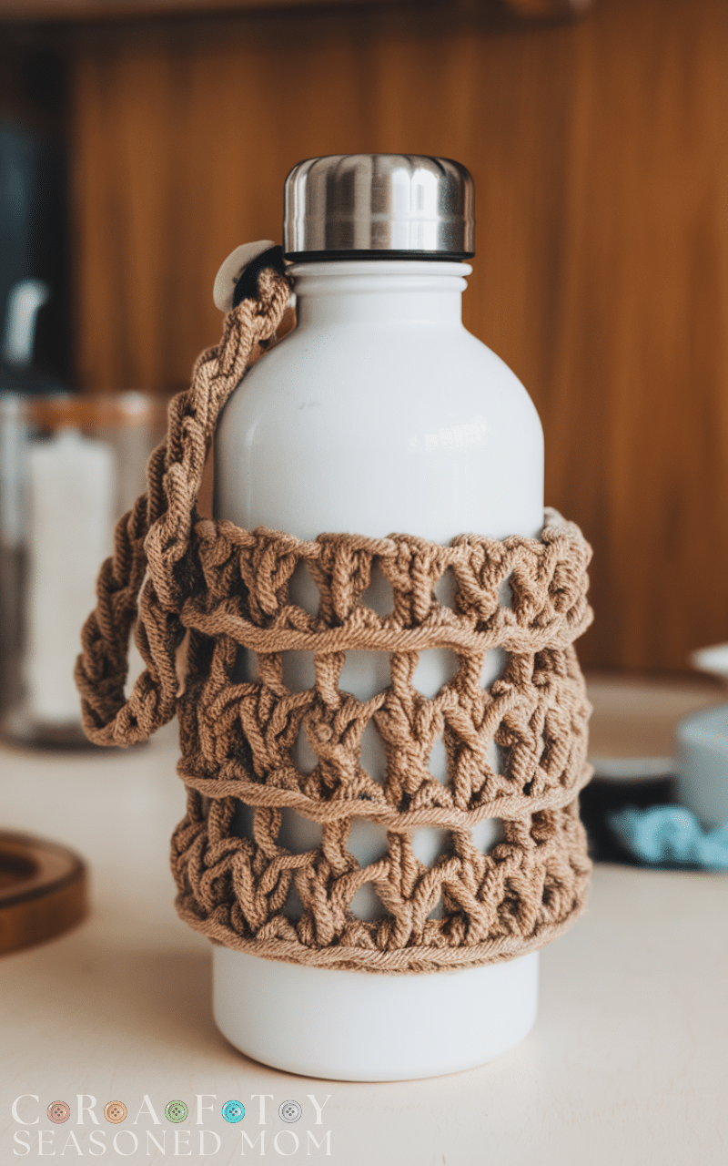 Chunky yarn creates bold and cozy Crochet Water Bottle Holder Ideas. This design works up quickly and provides strong support for larger bottles. Chunky holders feel soft in the hand and look trendy. They’re great for cooler seasons or as statement handmade accessories that stand out.