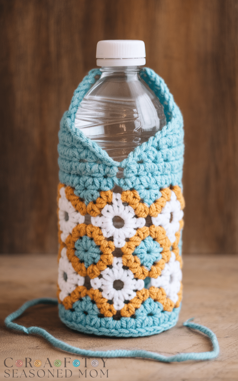 Granny stitches bring a vintage charm to Crochet Water Bottle Holder Ideas. This design allows you to play with colors while keeping the pattern simple and repetitive. Granny-style holders are fun to make and visually interesting. They are also sturdy and flexible, making them great for daily use. This idea is perfect if you love classic crochet styles with a modern twist.