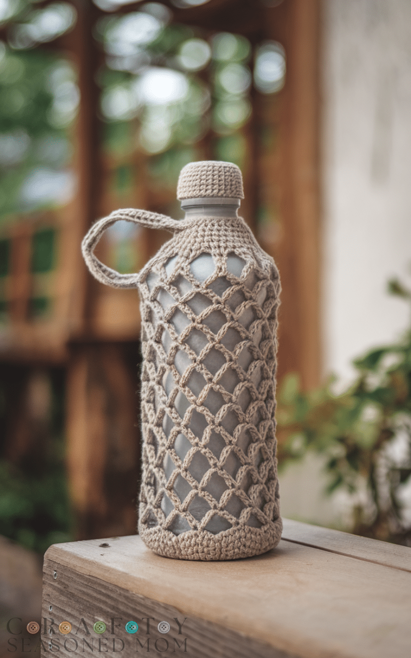 A mesh design is a lightweight option within Crochet Water Bottle Holder Ideas and works perfectly for warm weather. The open stitches stretch naturally, allowing the holder to fit different bottle sizes. This idea uses less yarn and dries quickly if it gets wet. Mesh holders are breathable, practical, and trendy, making them ideal for the gym, beach days, or outdoor activities.