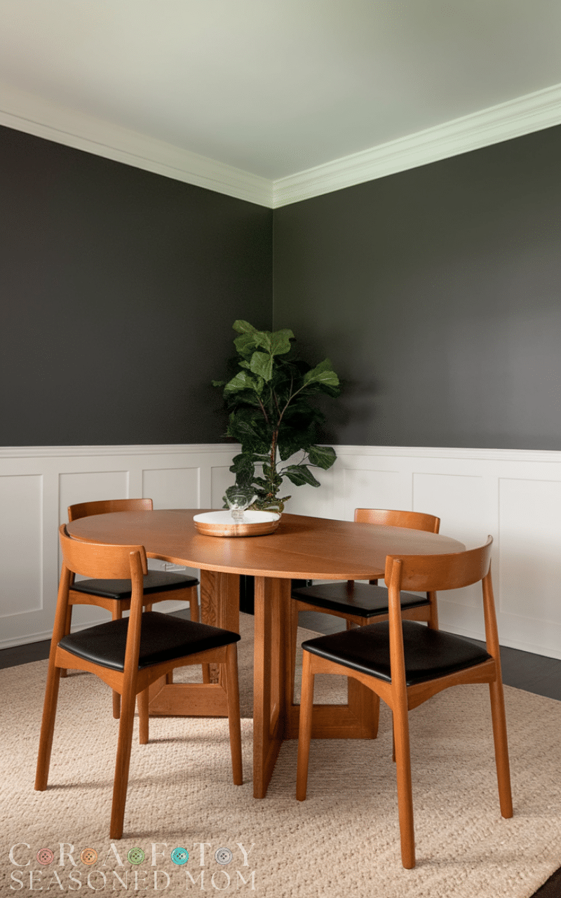 Charcoal gray can be one of the bold paint colors honey oak contrasts nicely with, especially for accent walls. The deep shade adds drama and depth, helping warm wood tones stand out in a modern way. It works best in well-lit spaces where the dark color won’t overpower the room. This combination feels contemporary and stylish.