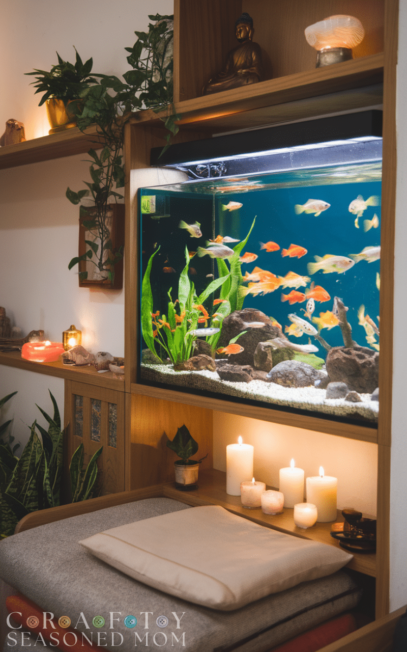 Placing a fish tank in a meditation or relaxation corner enhances Zen Fish Tank Ideas. Combined with candles, plants, or soft music, the aquarium becomes part of a calming ritual. The gentle movement of fish supports mindfulness and deep breathing. This setup transforms the tank into more than décor, it becomes a tool for relaxation and inner peace.