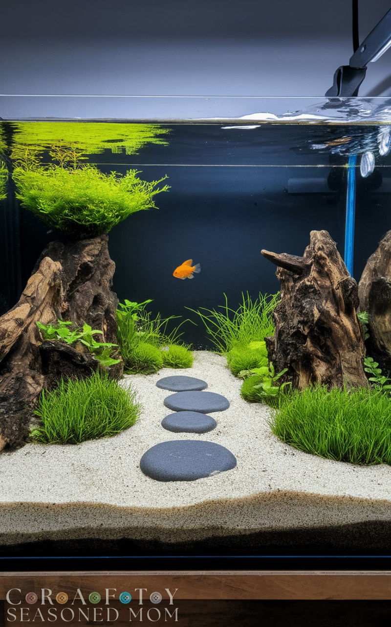 A stone path aquascape mimics traditional zen gardens and is one of the most artistic Zen Fish Tank Ideas. Small stones arranged like pathways create visual flow and depth. This design invites the viewer’s eye to wander slowly, encouraging mindfulness. Combined with sand and low plants, the tank becomes a peaceful underwater garden that feels balanced and intentional.