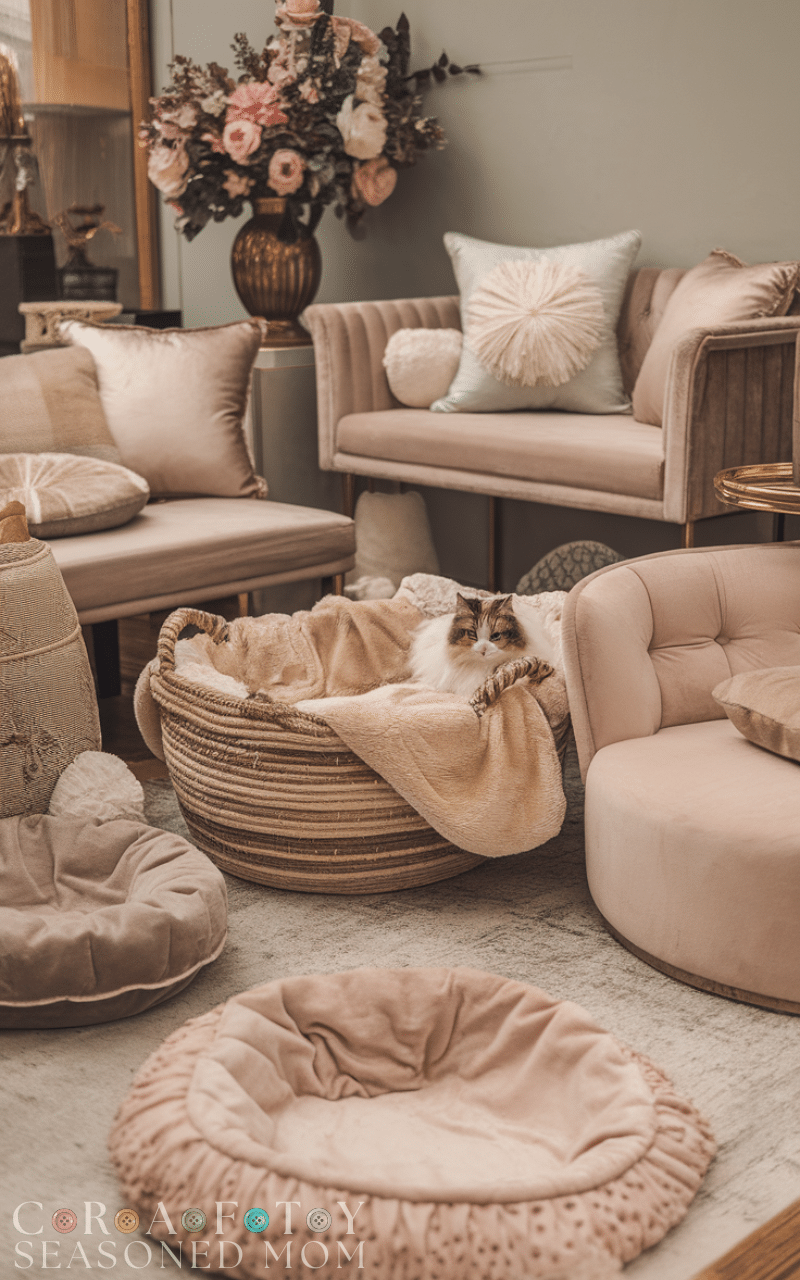 For the ultimate upgrade create a luxury cat lounge with soft bedding and plush rugs and stylish decor. Add elegant baskets or mini couches for your cat to rest on. These high end cat room decor ideas turn your pet’s corner into a five star retreat that looks stunning and feels even better.
