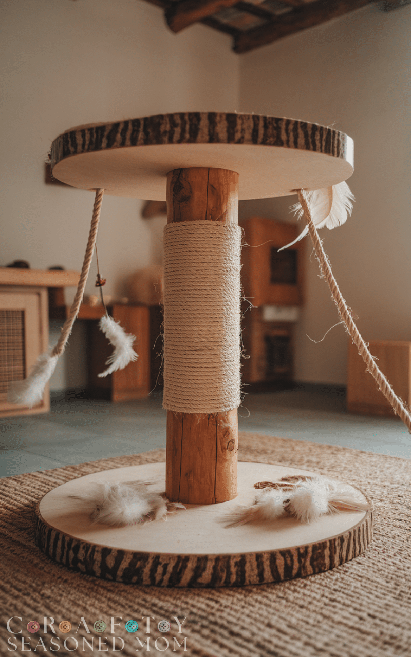Scratching is a natural habit for cats so create a dedicated zone for it. You can make scratching posts from wood and rope or buy ready made ones that fit your decor. This is one of the best cat room decor ideas to protect your furniture while giving your cat a fun place to play. Add toys or feathers nearby to make it even more enjoyable.