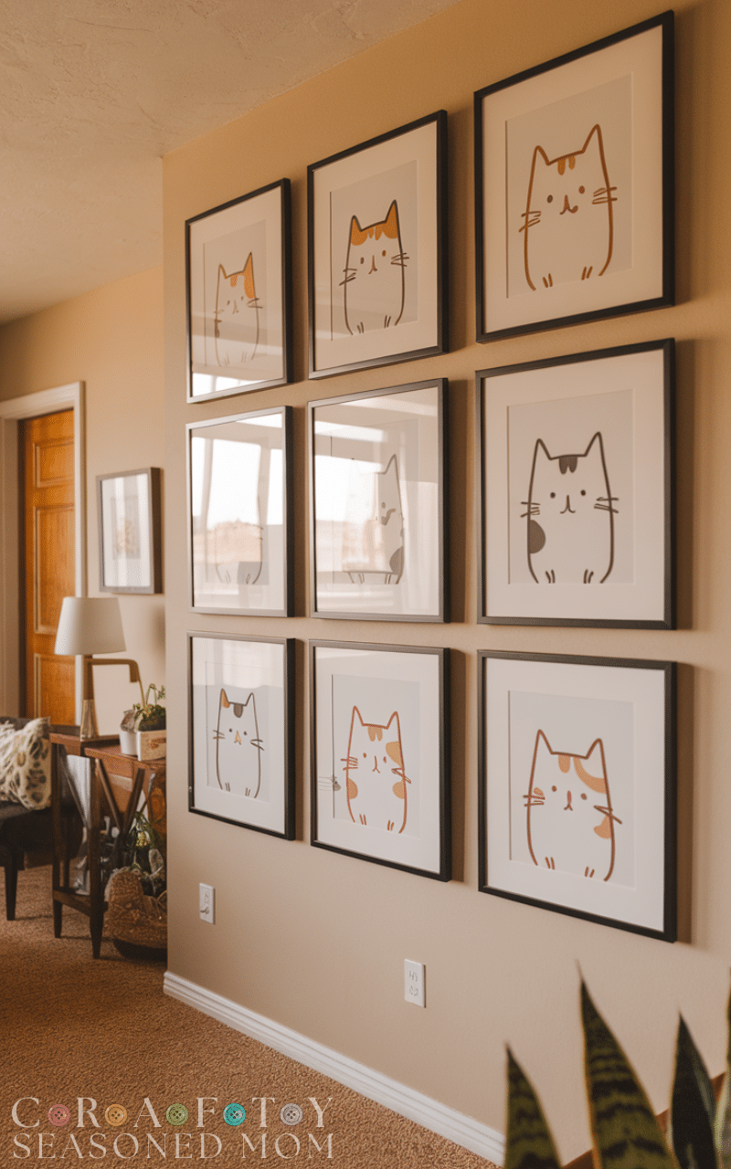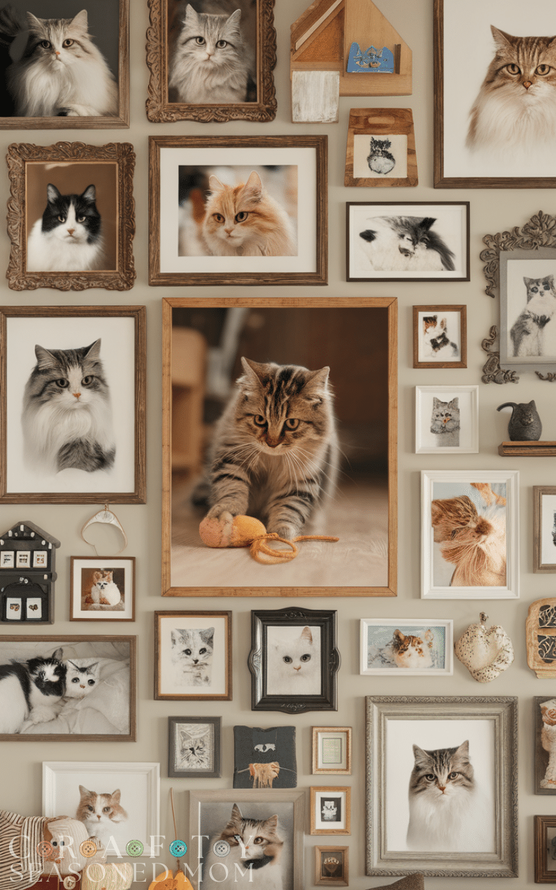 Turn one wall into an art gallery filled with photos of your cat and playful art pieces. These cat room decor ideas celebrate your pet’s personality while making the room warm and personal. You can mix frames of different sizes and styles to make it creative and charming.