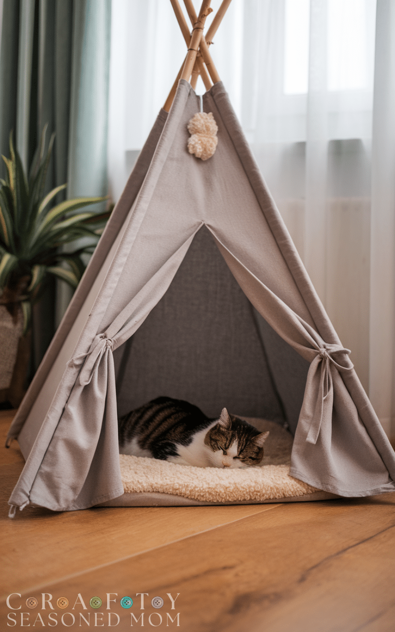 A cat teepee is one of the coziest cat room decor ideas because it gives your furry friend a private spot to relax. You can find small fabric tents or even make one at home using sticks and soft blankets. Decorate it with fairy lights or name tags to make it unique. This special corner helps your cat feel secure while adding a cute touch to your home design.