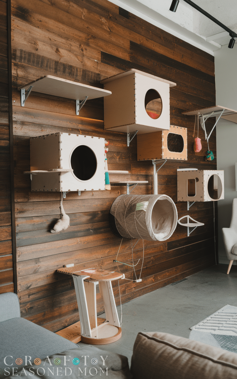 One of the most exciting cat room decor ideas is building a cat climbing wall that gives your pet a playground right at home. You can install shelves and ramps and tunnels that let your cat jump and explore in a fun and safe way. Choose materials that match your home decor so the wall looks stylish while still being functional. This design keeps your cat active and happy while turning your walls into a lively and beautiful part of the room.