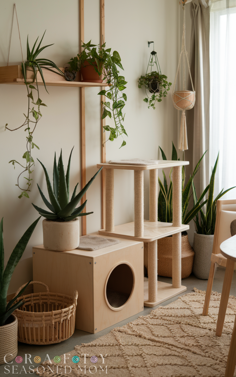 Bring nature inside with wooden elements and soft greens. Add cat safe plants and natural textures to make the room relaxing. These cat room decor ideas create a peaceful environment that both you and your cat will love. It feels like an indoor garden where your cat can play and rest.