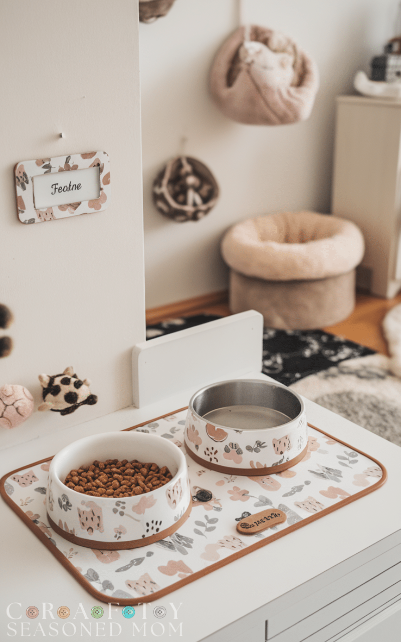 Design a feeding area that keeps food and water organized. Use stylish bowls and a small mat that matches the decor. This is one of the cleanest and most thoughtful cat room decor ideas because it prevents mess while keeping your cat comfortable during meals. Add a little name tag to make it even more special.