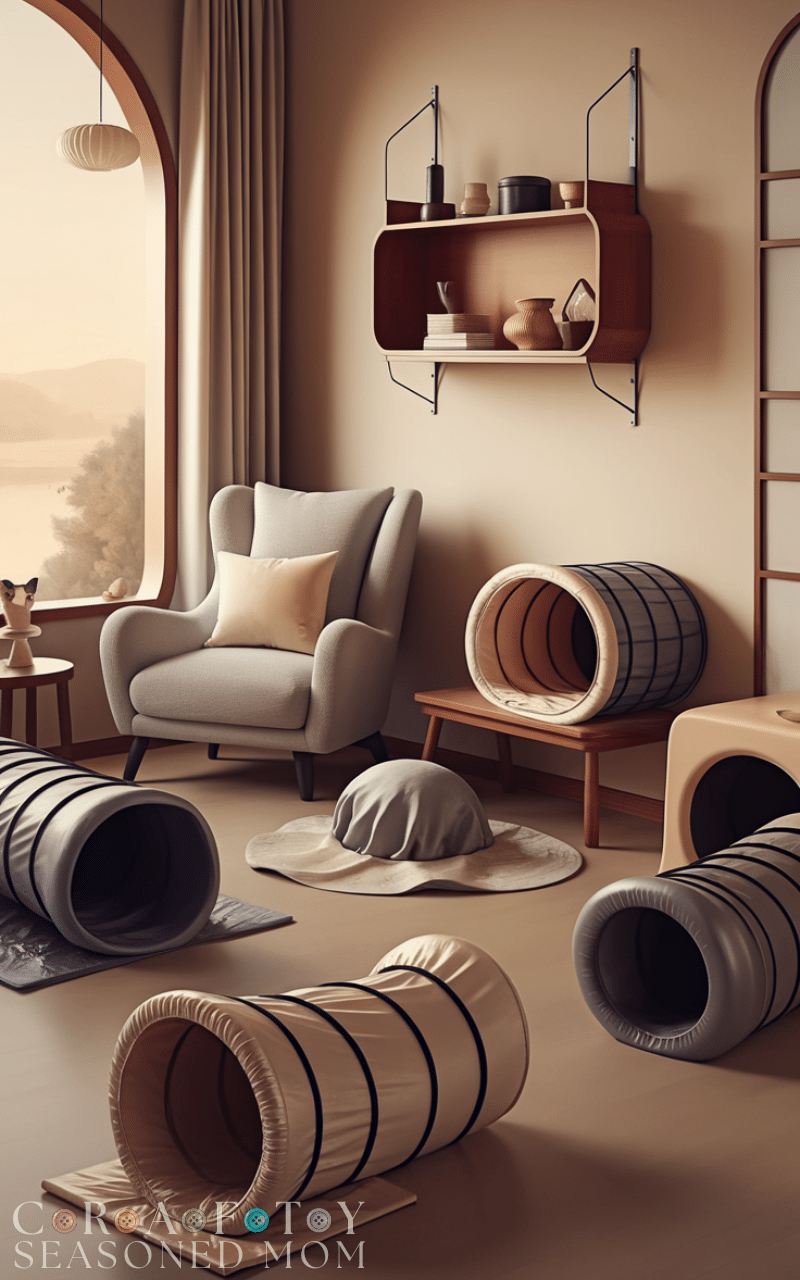 Add tunnels that your cat can crawl through and hide in because they love secret spaces. These tunnels can be made from fabric or plastic and can fit under furniture easily. The best cat room decor ideas mix fun and function and tunnels do exactly that by keeping your cat playful and active.