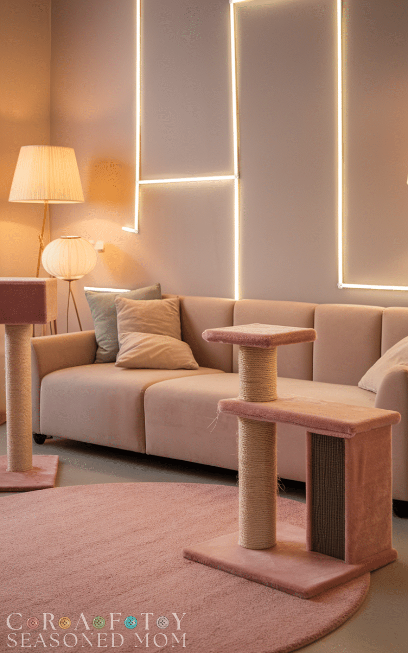 Cats feel more comfortable in soft lighting so use warm lamps or LED strips to make the space cozy. Avoid harsh lights that can disturb your cat’s naps. These cat room decor ideas create a soothing atmosphere that you will enjoy too. Try using shades of beige and soft pink and light grey to bring calmness to the room.