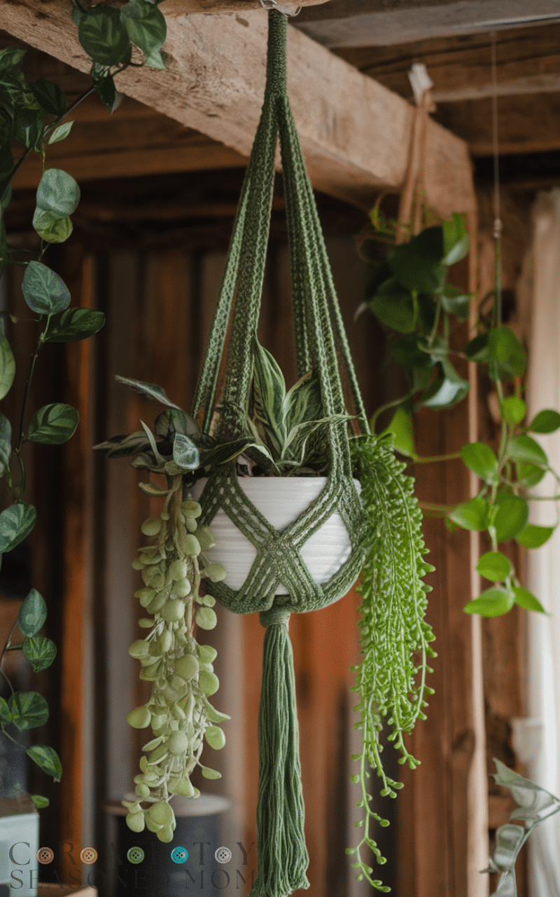 Plant hangers are trendy green crochet projects ideas that combine crochet with home décor. Green yarn blends beautifully with plants and enhances a natural indoor aesthetic. This project helps you learn knot-style crochet and simple shaping. Hanging plants in green crochet holders instantly makes any space feel calm and welcoming.