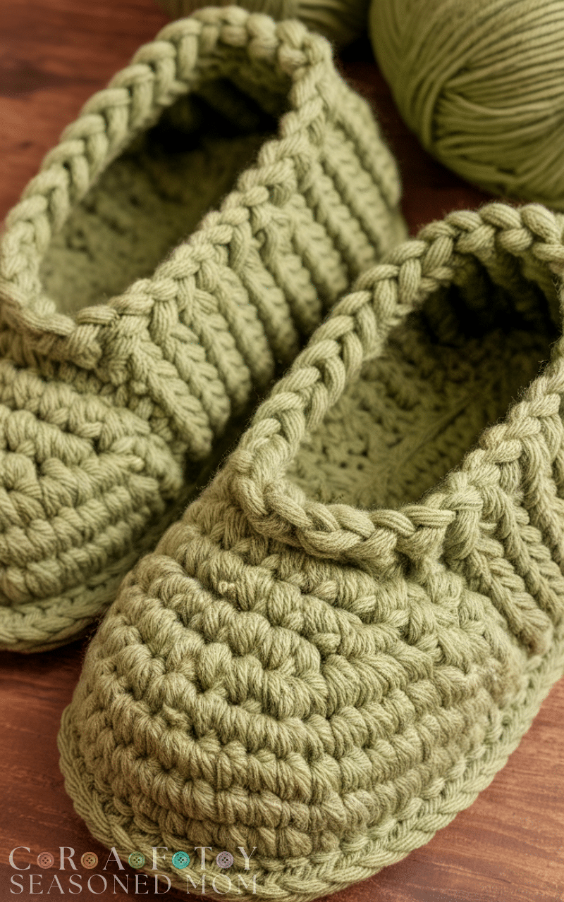 Crochet slippers are cozy green crochet projects ideas that are perfect for home use. Earthy green shades feel warm and calming. This project teaches shaping and joining techniques while creating something comfortable and practical.