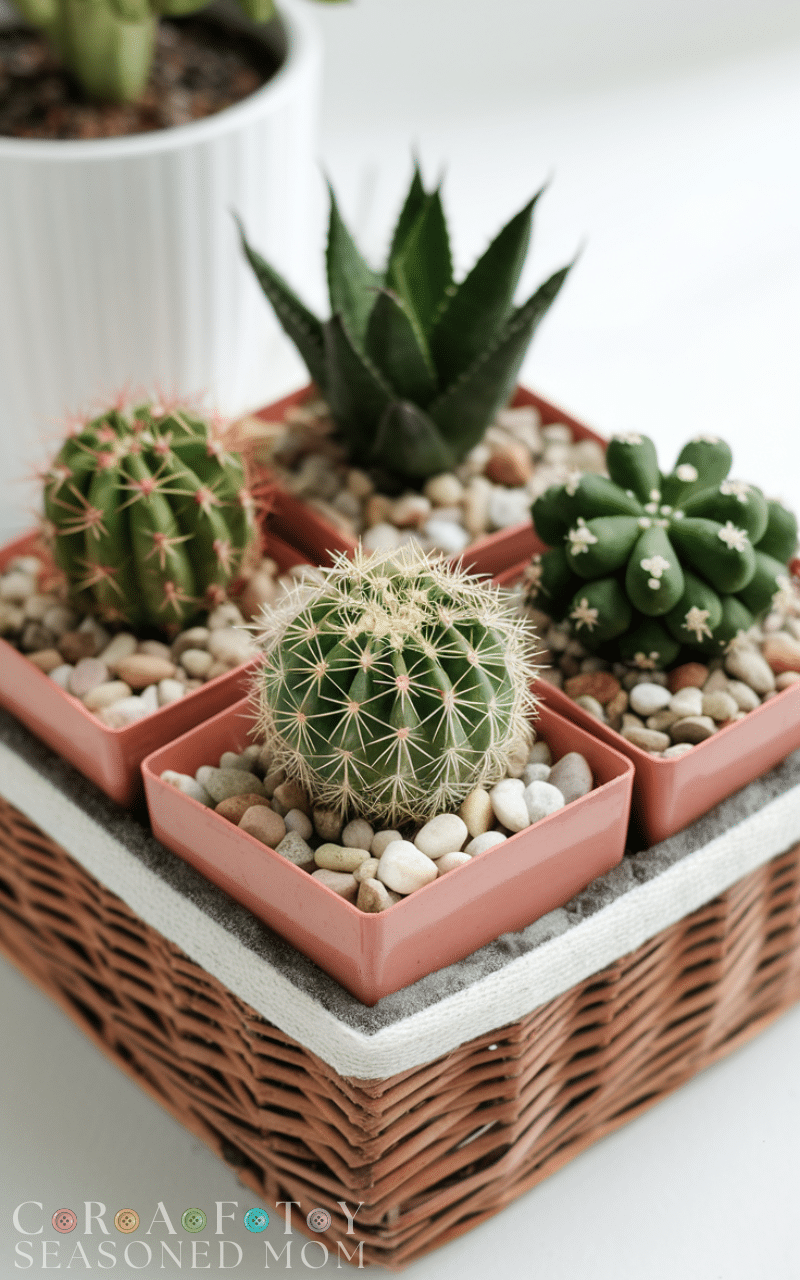 A mini cactus garden gift set is a thoughtful and lasting present because cacti symbolize endurance and beauty and you can arrange a few mini pots with small cacti decorate them with stones or sand and wrap them in a basket and this mini cactus garden idea makes a perfect gift for plant lovers or as party favors.