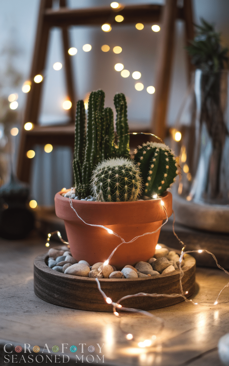 Adding fairy lights around your mini cactus garden brings a magical glow especially at night and you can wrap the lights around the planter or scatter them gently through the stones and it will turn your mini cactus garden into a cozy and dreamy corner in your home that catches everyone’s eye.