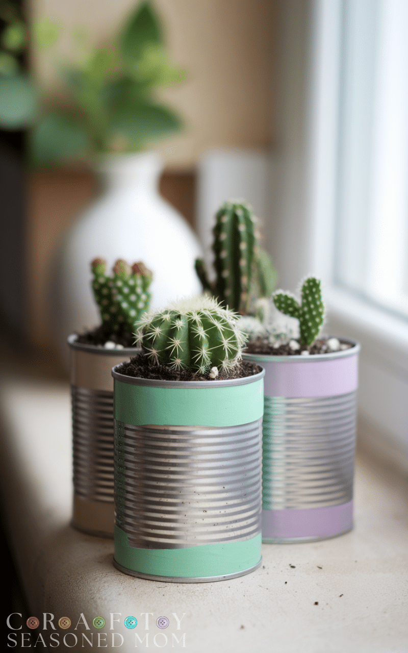 You can give old tin cans a new life by turning them into a recycled tin mini cactus garden which looks both creative and eco friendly and after cleaning the cans you can paint them in soft colors or leave them natural and fill them with soil and small cacti and this mini cactus garden works great as a kitchen windowsill decoration.