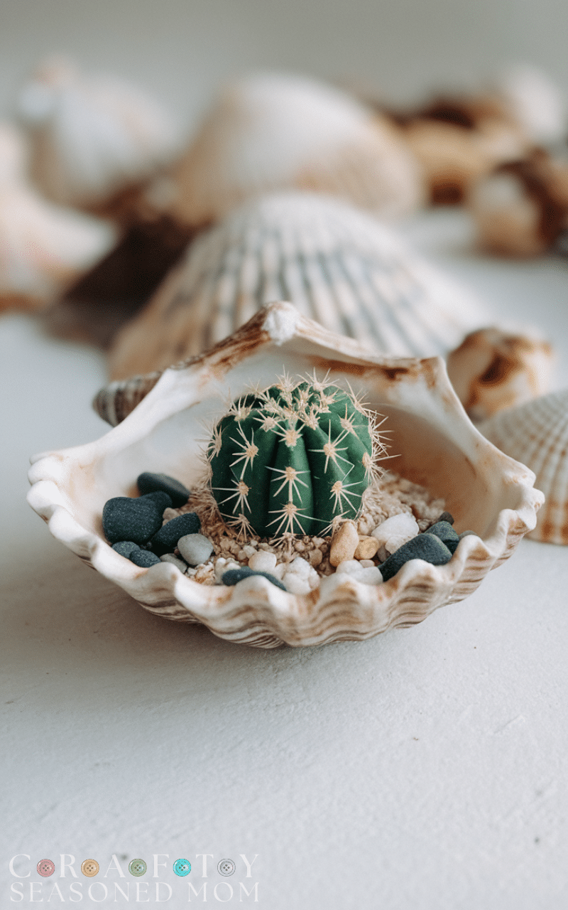 For a coastal twist you can make a mini cactus garden inside a large seashell and it looks unique and natural and brings together the desert and the sea in one design and this mini cactus garden is especially pretty as table decor or as a small gift for nature lovers and it’s easy to make because you only need a bit of soil and a mini cactus.