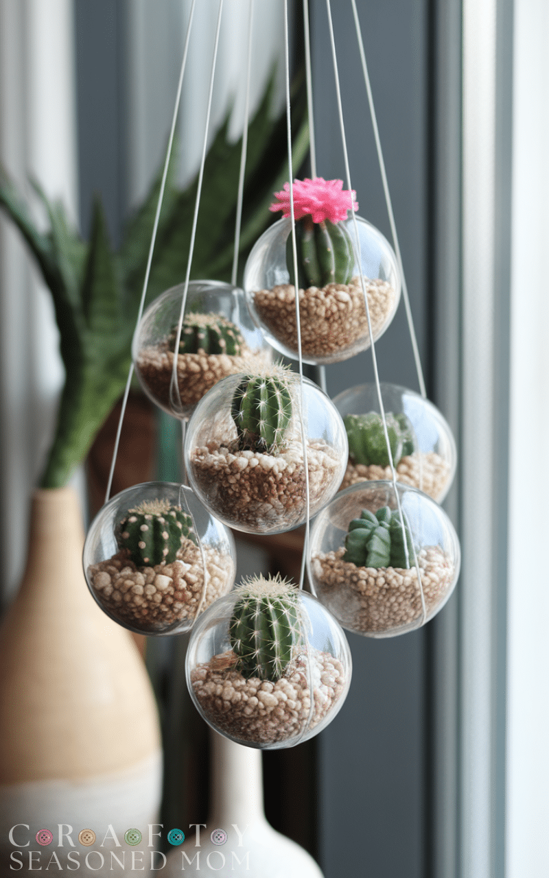 A hanging mini cactus garden is an excellent way to use vertical space while keeping your plants safe from pets or small kids and you can hang small glass globes or metal planters with miniature cacti near windows or in corners and the look is both modern and refreshing and this mini cactus garden adds movement and texture to your decor.