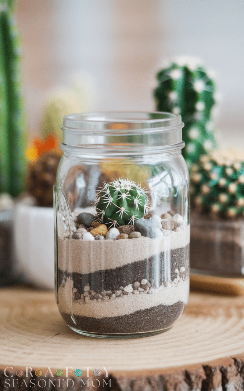 If you enjoy DIY projects then a mason jar mini cactus garden is a wonderful idea and you can layer sand pebbles and soil inside a clear jar and place a tiny cactus in the center to create a simple yet lovely design and this mini cactus garden is small enough to fit on any counter or shelf and adds a touch of charm wherever you place it.