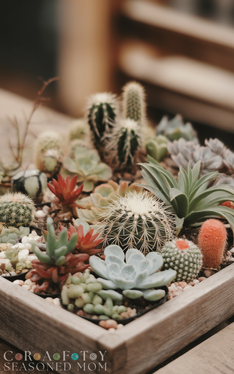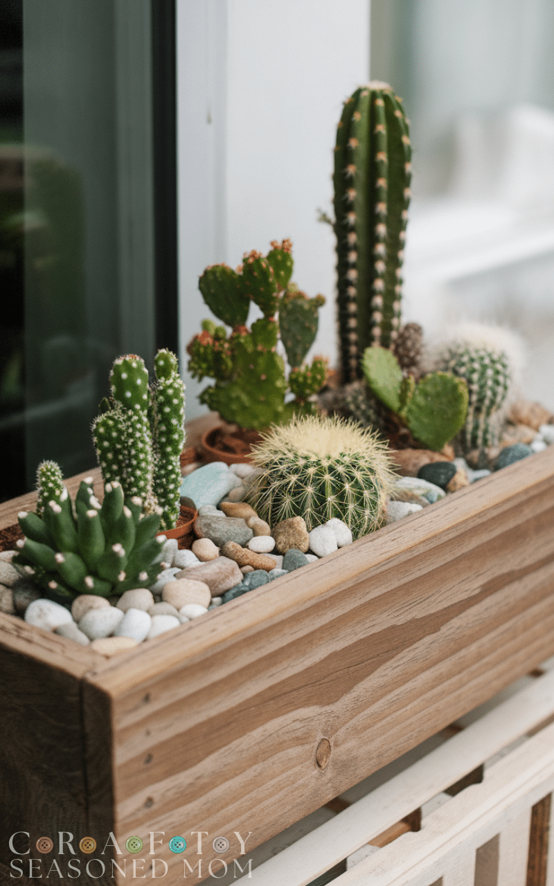 A wooden box mini cactus garden gives a rustic and natural charm to your space and it’s perfect if you love a cozy boho vibe and you can arrange small cacti of different shapes and sizes inside a shallow wooden box and decorate it with pebbles or driftwood to complete the look and this type of mini cactus garden looks amazing on a patio or balcony.