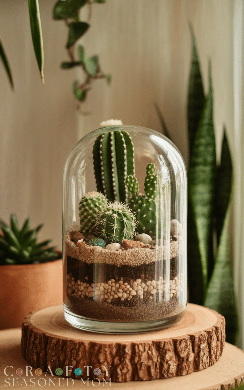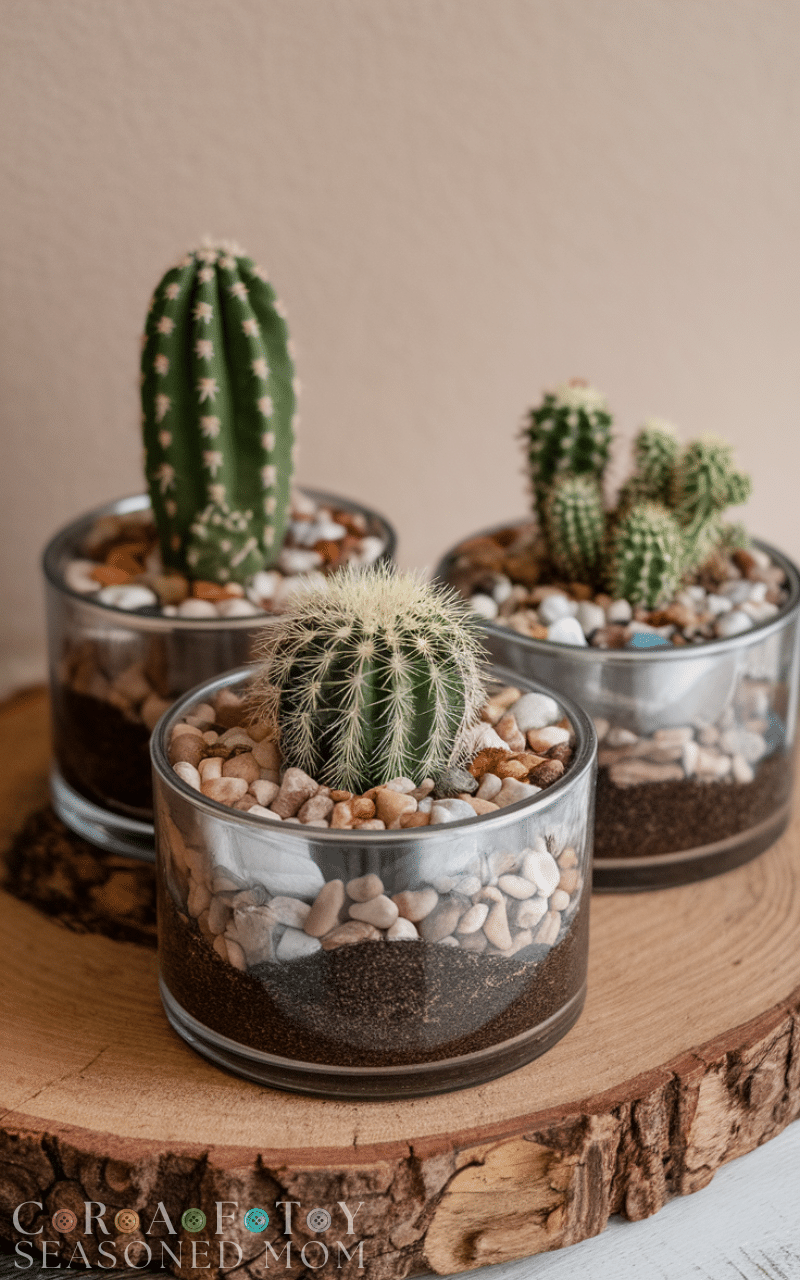 Creating a glass terrarium mini cactus garden brings a magical feel to your home since the transparent container allows you to see the layers of soil and sand and tiny stones and it turns your cacti into a living art piece and this mini cactus garden works great on a coffee table or near a window where the sunlight can shine through making it both stylish and calming to look at.