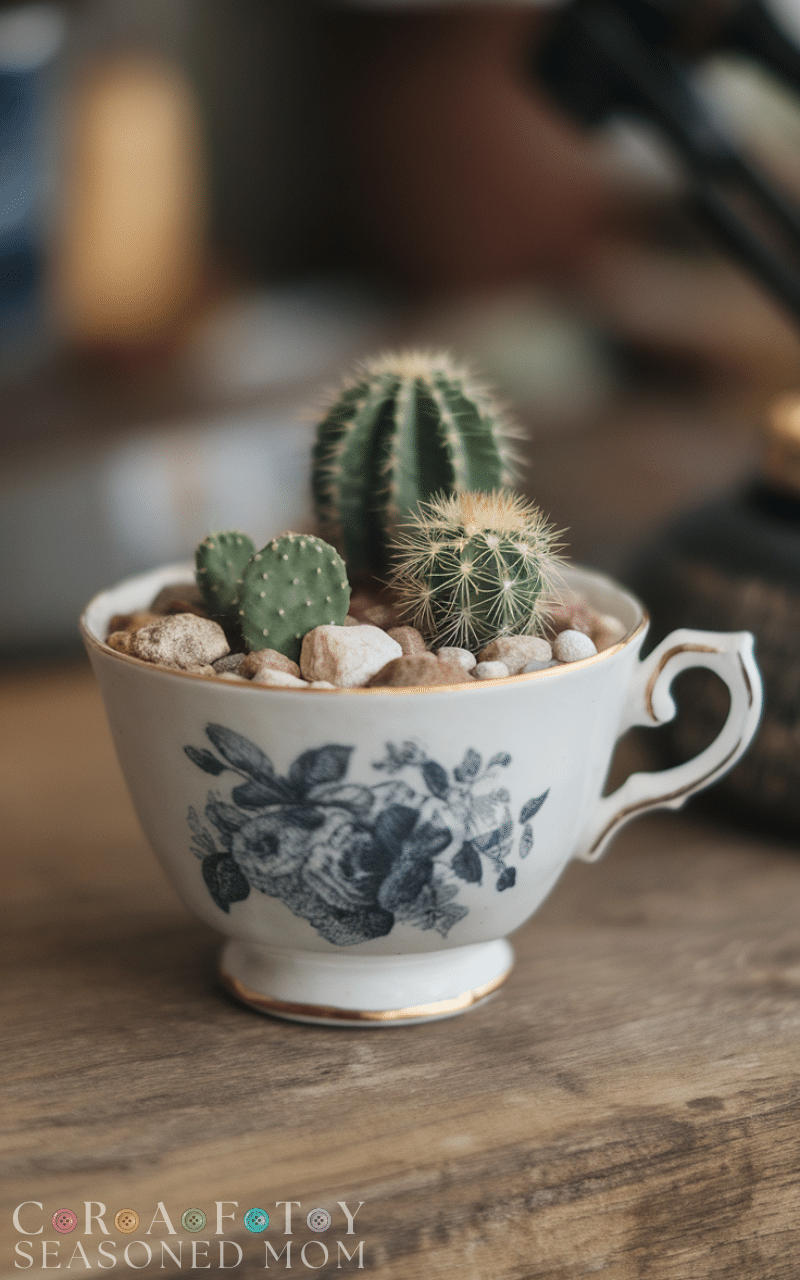A mini cactus garden in a teacup is such a cute and creative way to bring greenery to your table because all you need is a vintage cup and a bit of soil and some tiny cacti and the result is a beautiful little garden that fits perfectly on your desk or shelf and this mini cactus garden idea is easy to make and also a great way to reuse old kitchenware which makes it both decorative and sustainable.