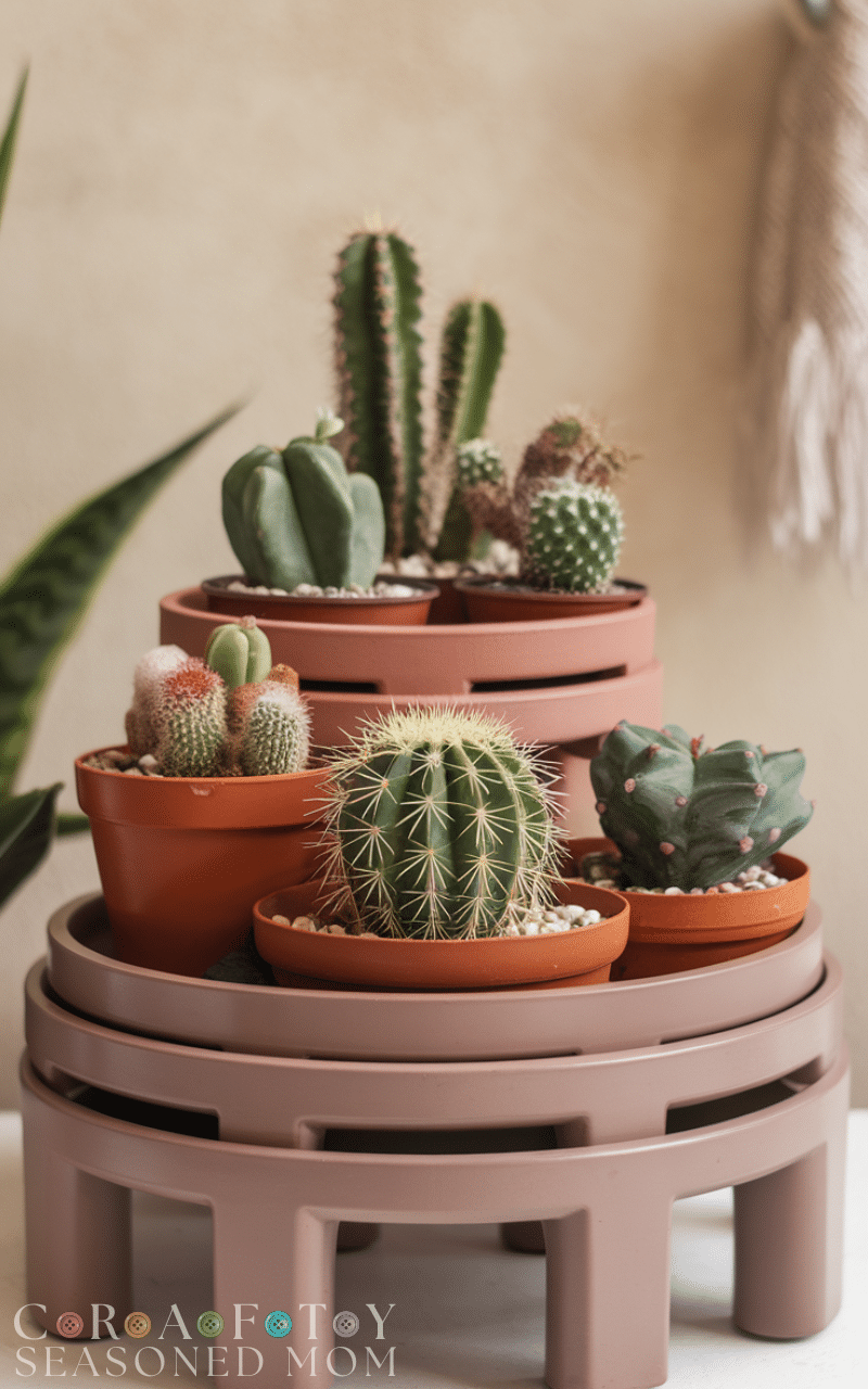 If you want something that stands out you can create a tiered mini cactus garden using multi level plant stands or stacked containers and this design allows you to show off several small cacti at different heights which adds depth and visual interest and this mini cactus garden becomes a living sculpture in your space.