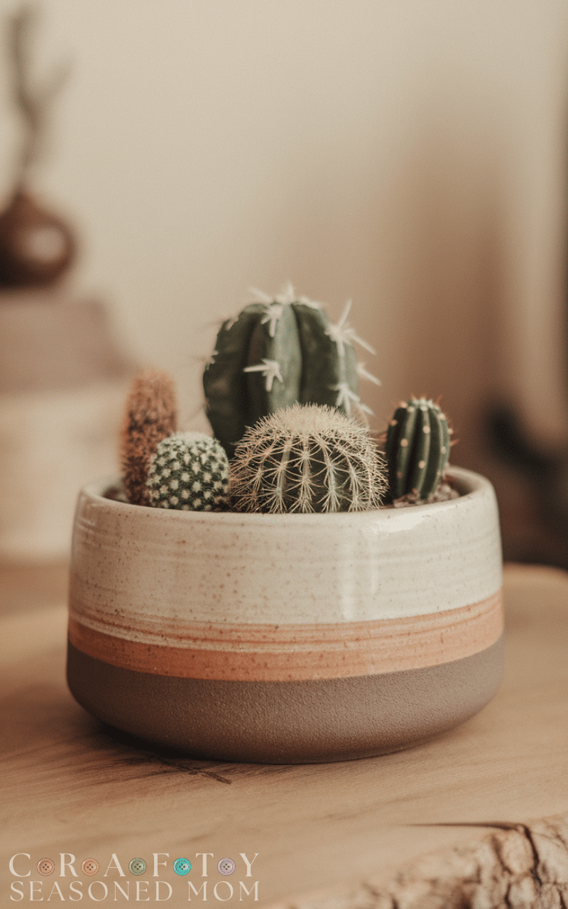 A ceramic bowl mini cactus garden looks simple yet elegant because the smooth texture of the bowl contrasts beautifully with the spiky cacti and you can pick colors that match your interior style to make it even more charming and this mini cactus garden is perfect for a dining or coffee table centerpiece.