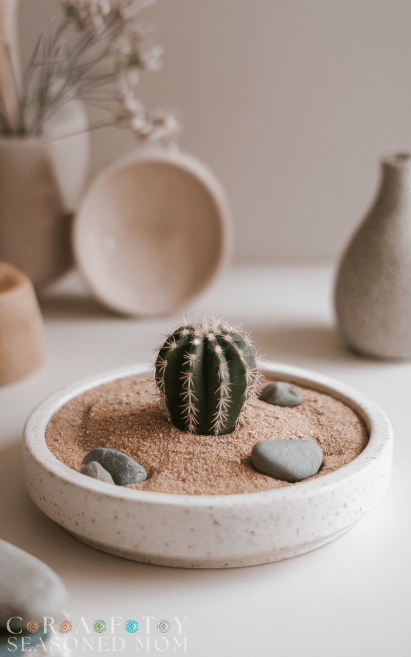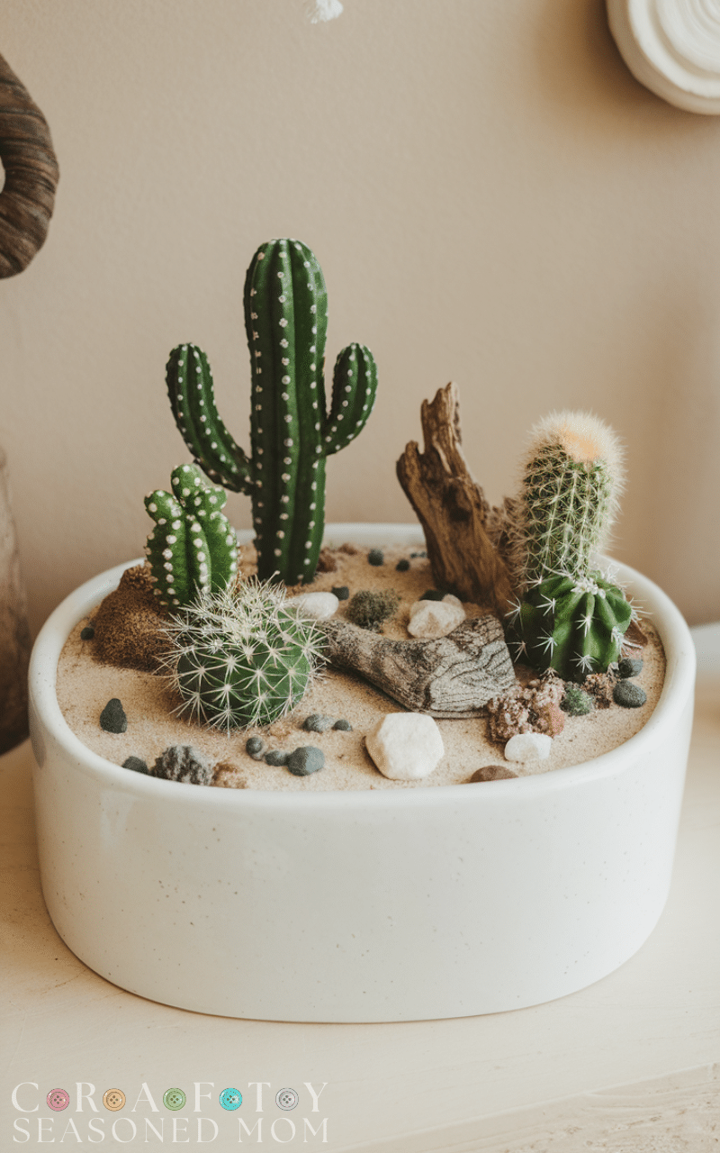 A Zen style mini cactus garden is perfect if you love calm and minimal spaces and you can use a shallow white dish filled with fine sand and small rocks to create a peaceful scene and then add one or two mini cacti to complete the balance and this mini cactus garden helps create a relaxing and meditative atmosphere.