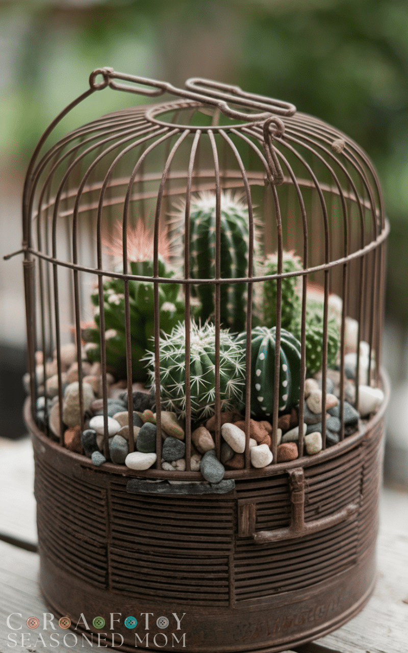 Using an old birdcage to make a mini cactus garden is a beautiful and unexpected idea because it combines the delicacy of metalwork with the strength of desert plants and you can hang it or place it on a table and fill it with different small cacti and pebbles to create a stunning statement piece.