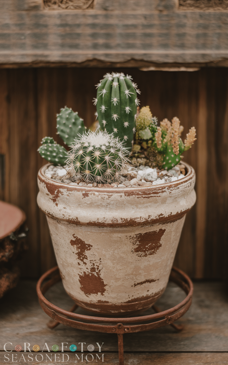 If you have an old ceramic pot or even an antique metal bowl you can turn it into a vintage pot mini cactus garden and the charm of aged containers adds character to your decor and gives the feeling of timeless beauty and this mini cactus garden can serve as a centerpiece for your living room or dining table.