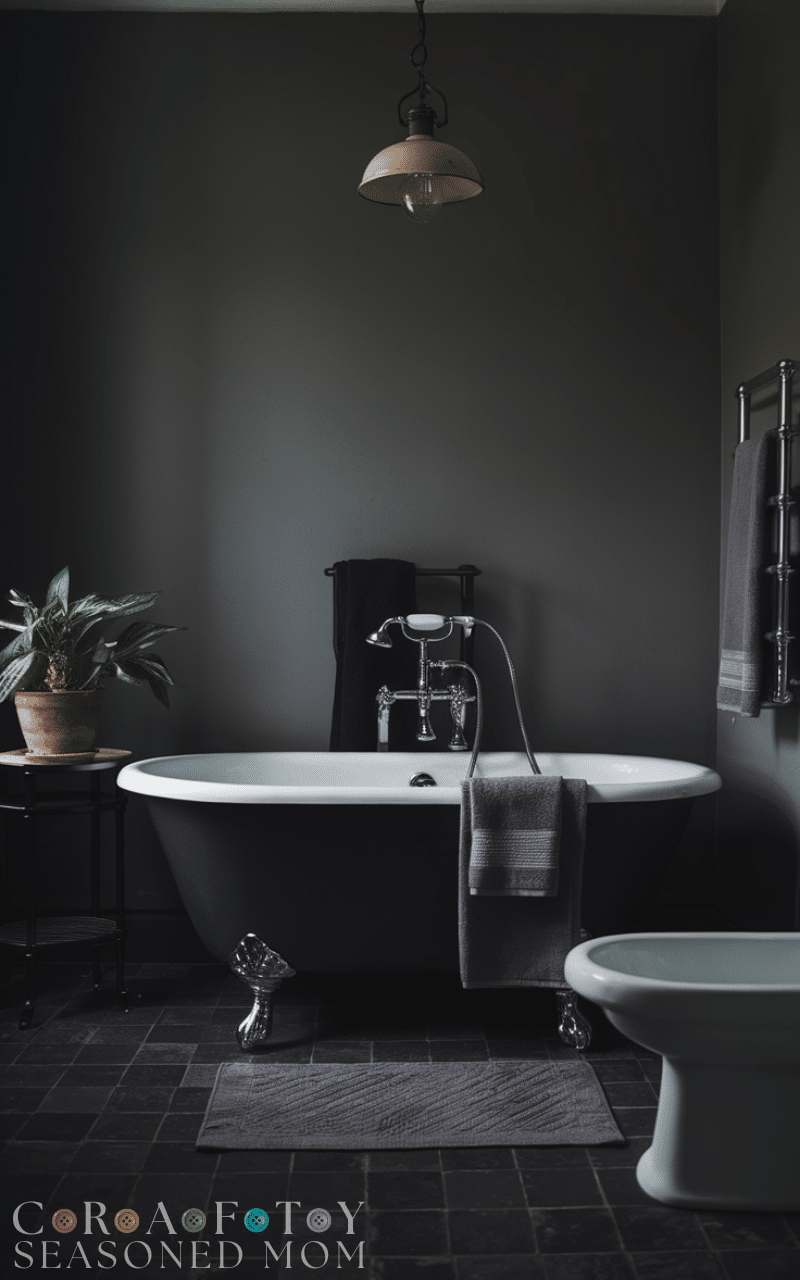 Using dark matte walls instantly sets the tone for a moody bathroom because the deep colors create a cozy and intimate atmosphere and when paired with soft lighting the moody bathroom feels like a relaxing sanctuary.