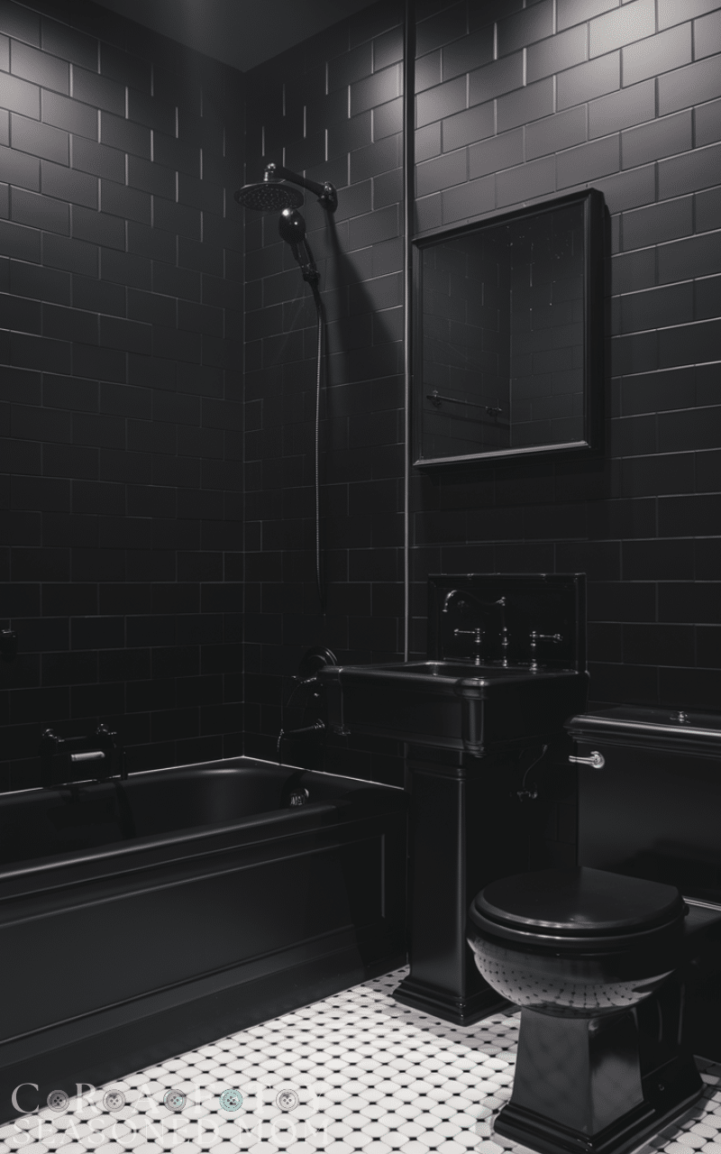 Using black fixtures can define the style in a moody bathroom and when combined with matte finishes the moody bathroom becomes modern and bold and you can mix taps and showerheads to emphasize the moody bathroom aesthetic.