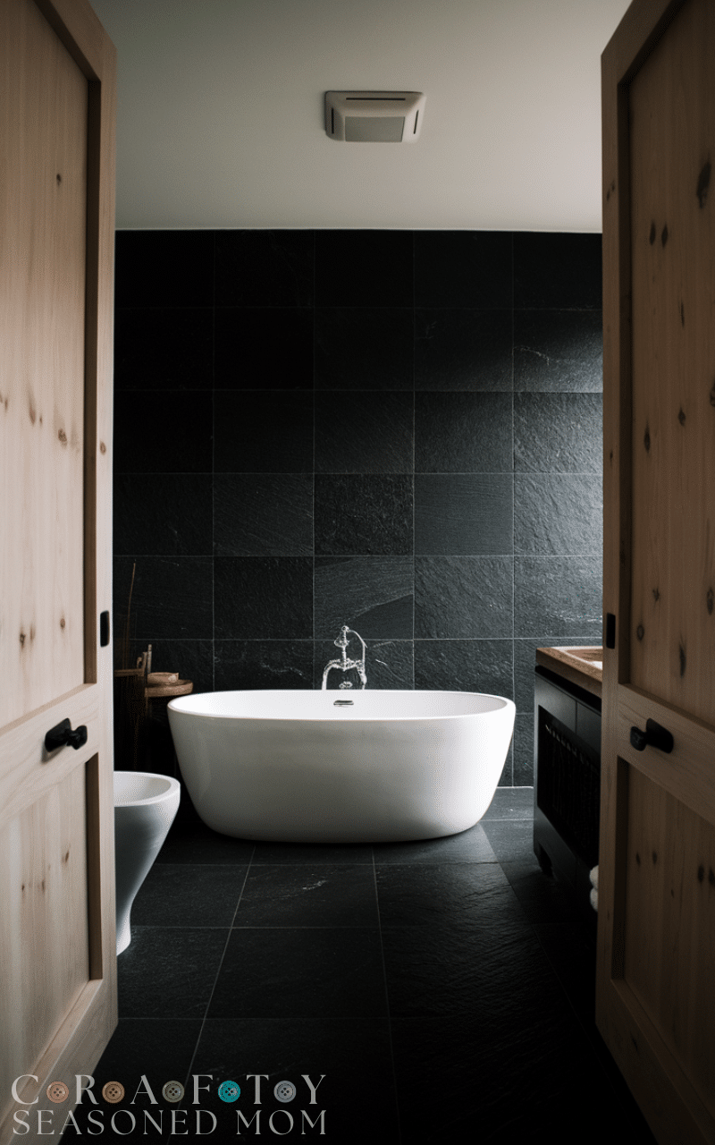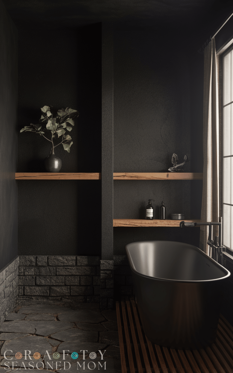Adding natural elements like wood and stone brings warmth into a moody bathroom because the textures balance dark colors and when paired with plants the moody bathroom feels organic and serene and creates a spa-like experience.