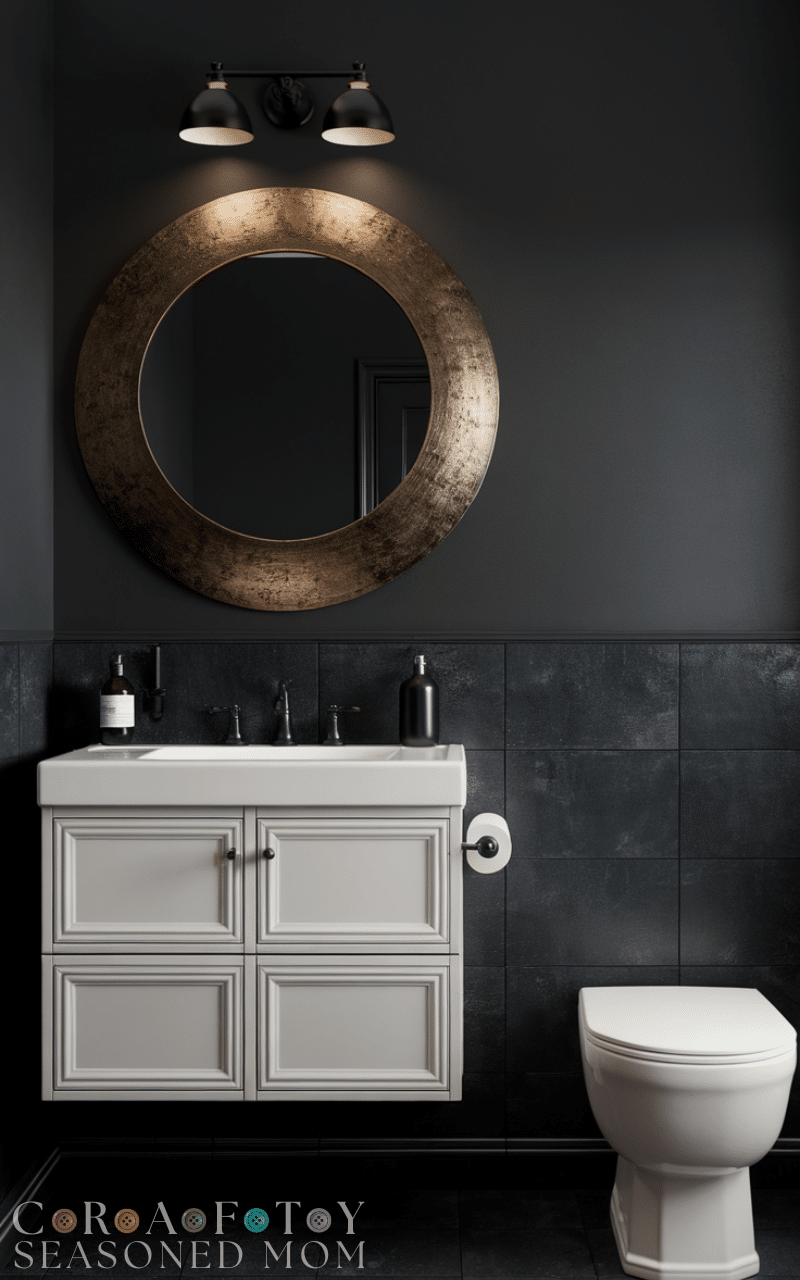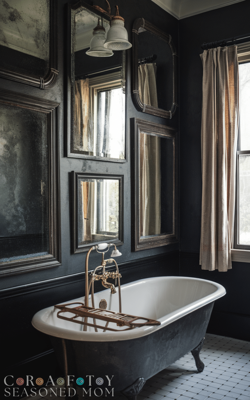 Selecting mirrors with dark or aged frames enhances the mood in a moody bathroom and when placed strategically the moody bathroom reflects light softly and adds a touch of elegance and you can experiment with shapes that complement the moody bathroom vibe.