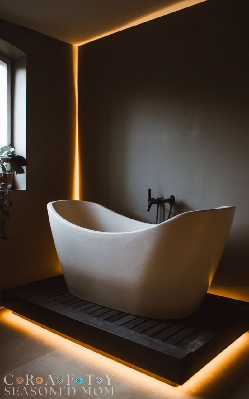A freestanding bathtub becomes the centerpiece of a moody bathroom and when surrounded by ambient lighting the moody bathroom creates the perfect retreat for relaxation and indulgence and you can choose curves and shapes that enhance the moody bathroom style.