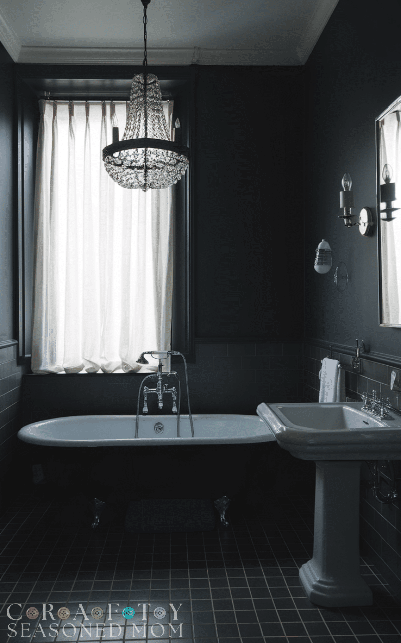 Adding statement lighting in your moody bathroom brings drama and style and when you choose fixtures with warm tones the moody bathroom feels inviting and luxurious and you can mix chandeliers with sconces to add personality.