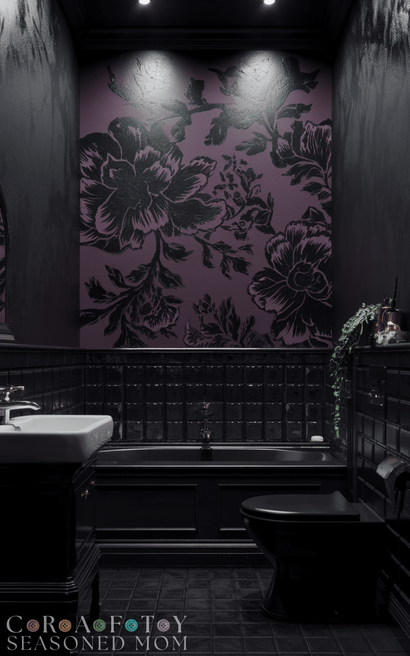 A statement wall can define the personality of your moody bathroom and when you use wallpaper or dark paint the moody bathroom becomes dramatic and captivating and patterns or textures emphasize the moody bathroom aesthetic.