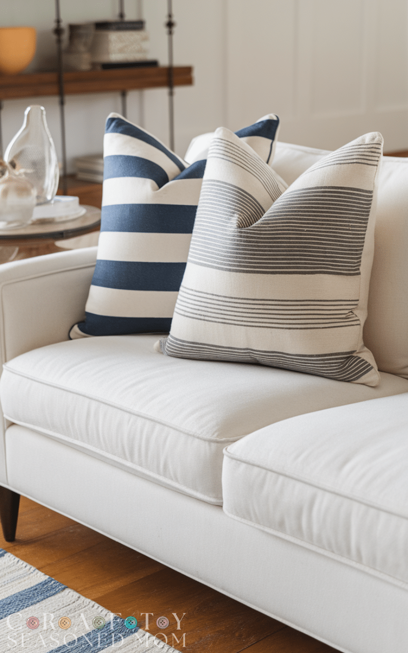 Striped pillows are a fantastic choice for a white couch because they add structure and rhythm to your decor while still looking timeless and fresh and depending on your taste you can go for thin stripes for a subtle look or wide ones for a bold statement and the lines draw attention to your couch while keeping the room feeling balanced and polished and this design works in modern traditional or coastal interiors with equal beauty.