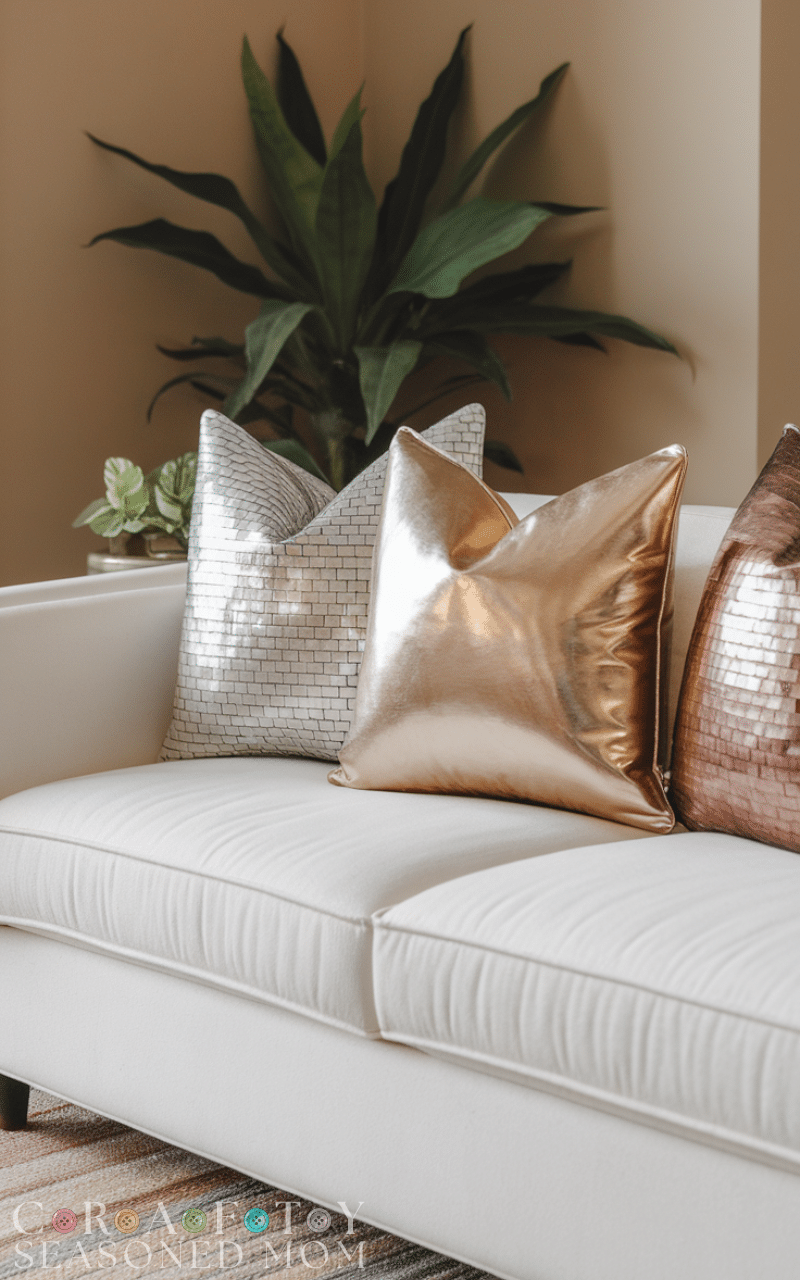 For a sparkling elegant touch then metallic pillows can make your white couch look high end and chic and the gentle shimmer of gold silver or bronze catches the light beautifully while giving your space a stylish and festive mood and these pillows are perfect for modern and glam homes because they make the couch stand out and feel special without overwhelming the room.