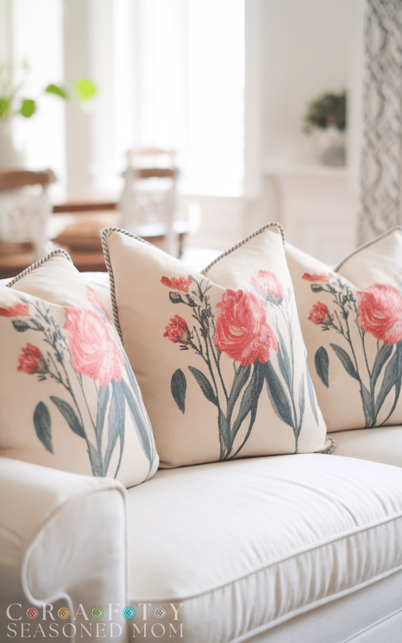 Floral pillows are a lovely choice for a white couch because they add a soft feminine touch that feels cheerful and bright and the patterns bring life and movement into the room while keeping it gentle and inviting and whether you choose small delicate flowers or bold oversized prints these designs help your white couch look lively and full of personality and it is a simple way to bring the beauty of nature inside your home.