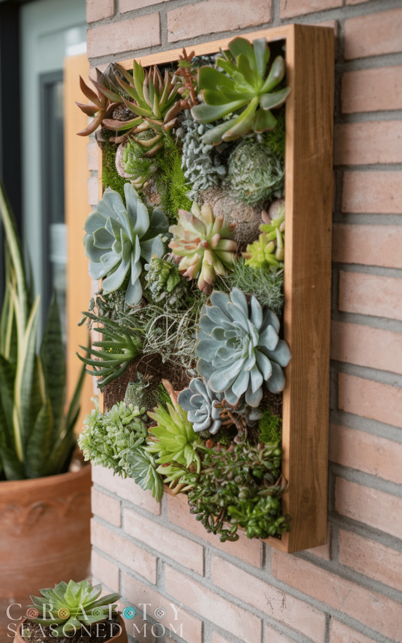 A succulent wall frame is a cool garden idea that adds texture and color without needing much maintenance because you can arrange different succulents inside a wooden frame and hang it on your wall like a living painting and it looks stunning all year round as these plants need little water and care and this design adds a modern artistic vibe to your outdoor or indoor space.