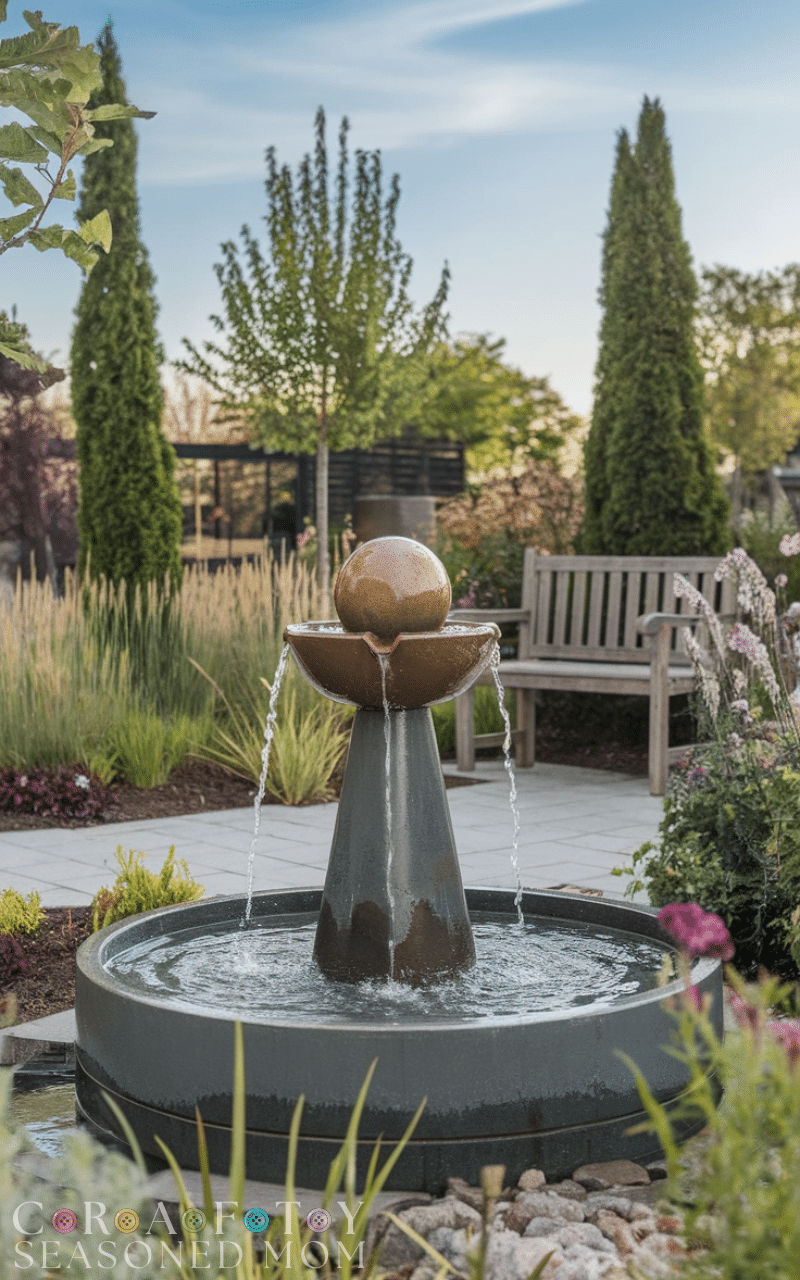 Adding a mini water fountain is a cool garden idea that creates a peaceful relaxing sound while making your garden look elegant and calm because the flowing water adds movement and freshness and it attracts birds and butterflies which makes your space feel alive and you can choose a solar powered one to save energy and place it near your seating area for a soothing touch every time you step outside.