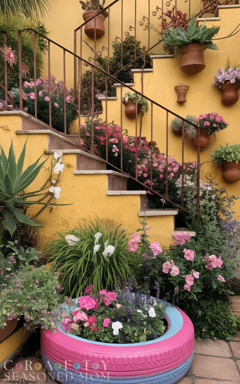 Recycling old tires into colorful planters is a cool garden idea that gives a playful and eco friendly twist to your outdoor design because you can paint the tires in bright shades then stack or hang them and fill them with flowers or herbs and they become fun creative pieces that make your garden stand out and it is a budget friendly project that anyone can do to add personality and color to the space.